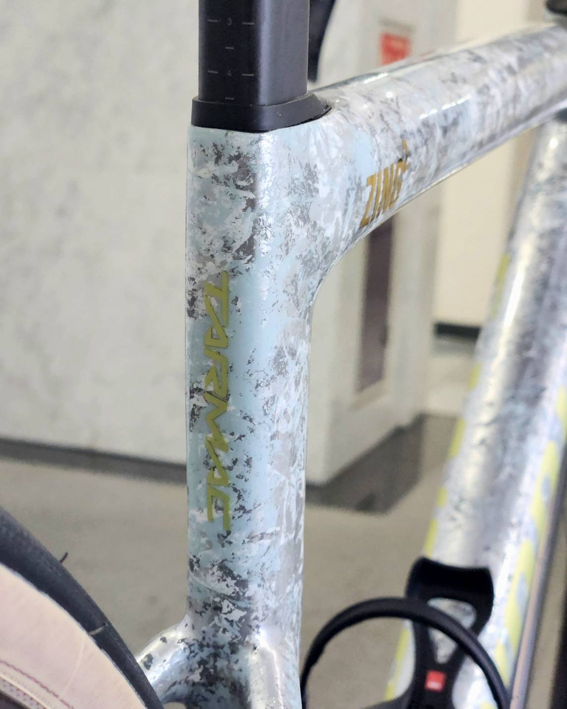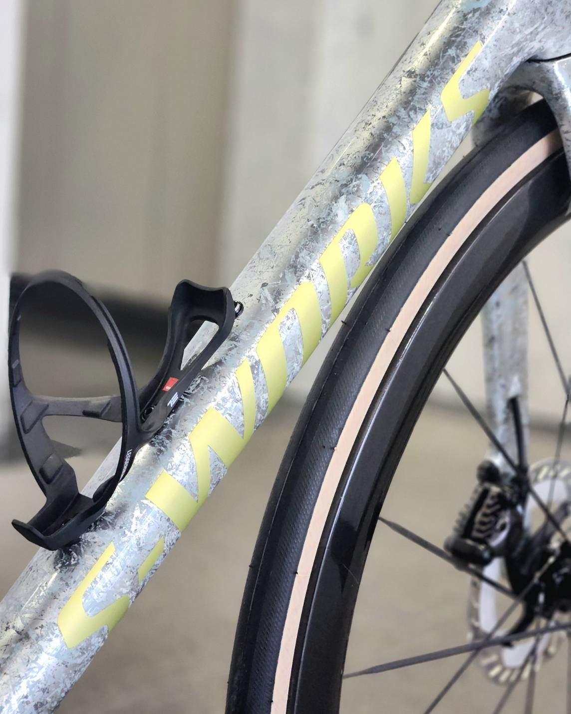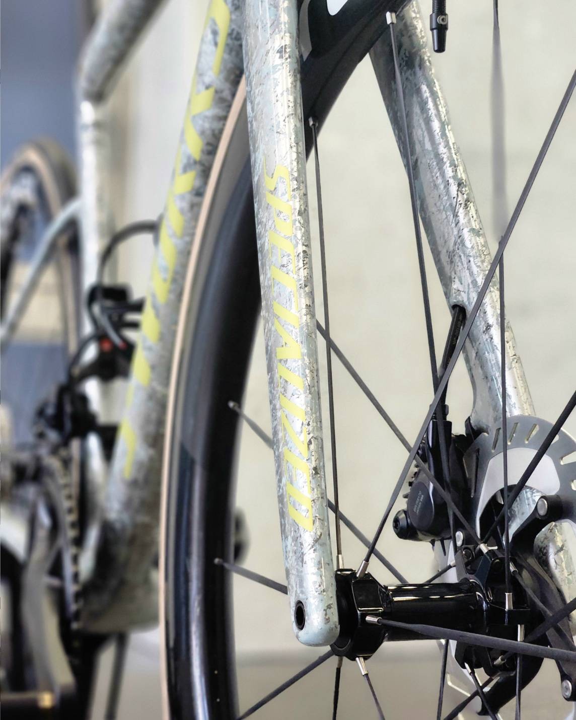 ・フレーム:S-WORKS TARMAC SL8 サテンリキッドシルバー/マルチカラードライインパスト/グロスチームイエローティント